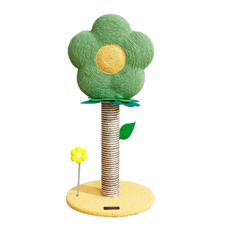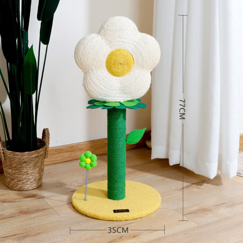 Floral cat scratching post with durable sisal-covered bar and carpeted base.